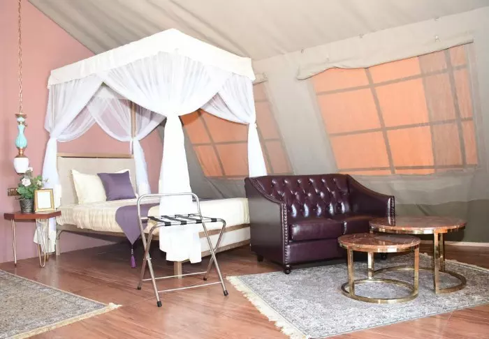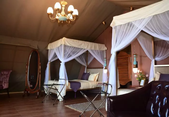 Alle Zelte sind geschmackvoll mit Himmelbetten und Moskitonetz, Schreibtisch, Sofa, Kronleuchter und generell viel Platz eingerichtet.