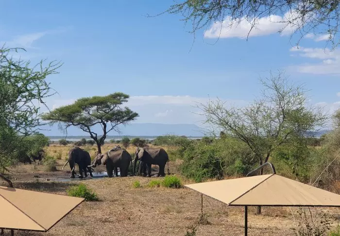 Die Aussicht von der angehobenen Terrasse der Tarangire Simba Lodge ist atemberaubend. Fast müsste man gar keine Safari machen. Das hier dauerhaft vorhandene Wasserloch lockt den ganzen Tag lang Tiere an. Direkt vor Ihnen, Sie können aus der ersten Reihe zuschauen.