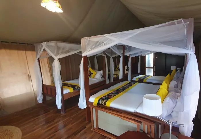 Es gibt hier 24 Zelte mit Platz für 2 bis 3 Personen pro Zelt. Die Zelte sind groß und alle mit Dusche und Toilette, Schreibtischen und großen Betten mit Moskitonetz ausgestattet. Jedes Zelt verfügt darüber hinaus über eine kleine „Terrasse“ im Freien mit Gartenstühlen. Hier können Sie sich entspannen und die fantastische Umgebung genießen. Darüber hinaus gibt es ein großes Gemeinschaftszelt, das als Speisezelt genutzt wird.