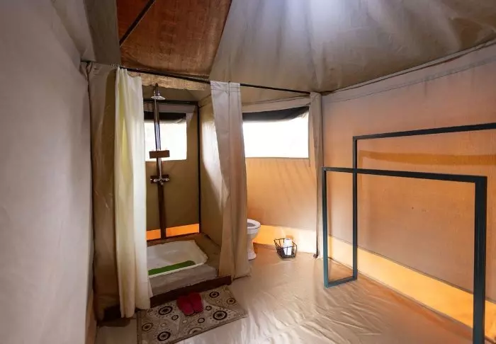 Das Zeltcamp besteht aus sieben luxuriösen Zelten, die alle auf einer eigenen Plattform mit einem Balkon stehen, von dem aus man den schönsten Blick auf die Dindira-Ebene unter sich hat. Die Zelte sind groß und geräumig und sehr gut ausgestattet. Sie verfügen über ein eigenes Bad – das allerdings am besten für gemeinsam reisende Paare geeignet ist – und wirklich bequeme Betten.
