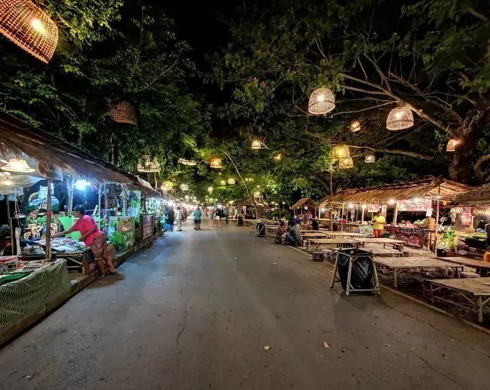 Als nächstes halten Sie an einem lokalen Nachtmarkt, wo Sie Zeit haben, zwischen den vielen Ständen umherzuwandern. Entdecken Sie lokale Köstlichkeiten wie geschmorten Schweinebraten (Khao Kha Mu), Kokospudding und Klebreis mit Ei (Bua Loi Khai Waan).