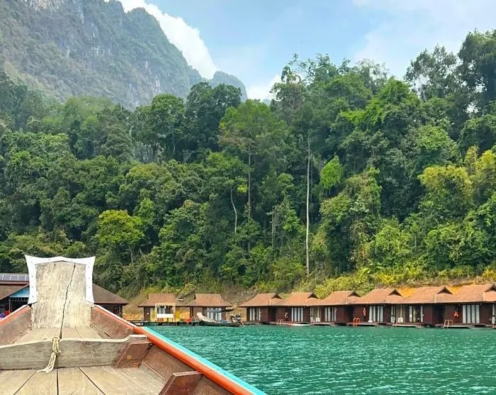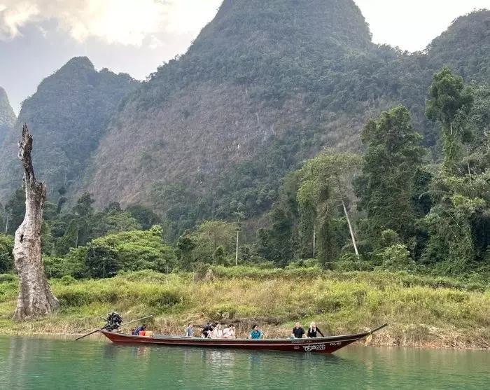 Anschließend fahren Sie zum Ratchabrapa-Pier in der Nähe des beeindruckenden Damms. Hier steigen Sie in ein Longtail-Boot und fahren auf den Cheow Lan See, wo die majestätische Landschaft mit ikonischen Kalksteinklippen wartet.