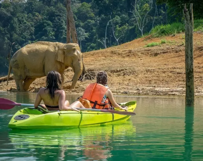 Die Fahrt vom Flughafen Surat Thani zu Ihrem Hotel dauert etwa 1 Stunde und 40 Minuten. Nach Ihrer Ankunft in Ihrer Unterkunft genießen Sie eine entspannte Kanufahrt auf dem Sok-Fluss. Es ist ein wirklich bezauberndes Erlebnis, lautlos auf dem Wasser zu treiben und die Geräusche und Eindrücke des umliegenden Regenwaldes aufzusaugen. Bewundern Sie die imposanten Kalksteinfelsen und die üppige, farbenprächtige Natur. Lauschen Sie dem Gesang der Vögel hoch in den Baumwipfeln und halten Sie am Flussufer Ausschau – mit etwas Glück entdecken Sie vielleicht einen Leguan . Das Beste daran ist: Sie können sich einfach zurücklehnen und entspannen, während Ihr lokaler Guide das Paddeln für Sie übernimmt.