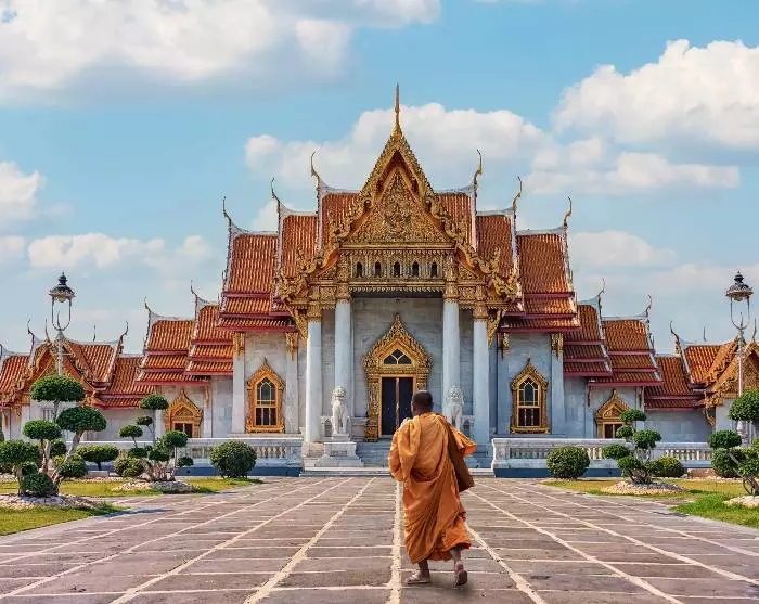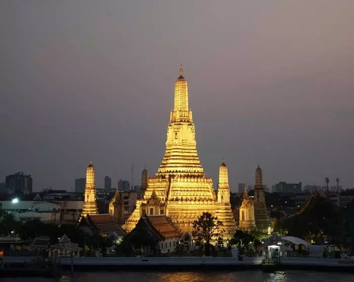 Auf dem Weg dorthin werden Sie einen Blick auf die beliebten Wahrzeichen Bangkoks erhaschen, die am Abend wunderschön beleuchtet sind. Sie werden zum Beispiel das Monument der Demokratie sehen, das an die Abschaffung der absoluten Monarchie und die Einführung einer konstitutionellen Monarchie in Thailand erinnert. Das Denkmal befindet sich an der belebten Ratchadamnoen Avenue – nicht weit vom Königspalast, dem Grand Palace, entfernt.