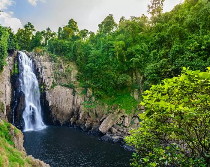 Sie wandern zurück zum Ausgangspunkt und werden zum Haew-Narok-Wasserfall gefahren, der zu den schönsten Wasserfällen des Nationalparks gehört. Er besteht aus drei Stufen und hat eine Gesamthöhe von etwa 150 Metern, was ihn zum höchsten Wasserfall von Khao Yai macht. Vom Parkplatz bis zum Wasserfall ist es ein Fußmarsch von etwa 1 km über einen Naturpfad und Stufen durch den üppigen Wald. Bitte beachten Sie, dass es in der Regenzeit sehr rutschig sein kann und der Weg nicht für Gehbehinderte geeignet ist.