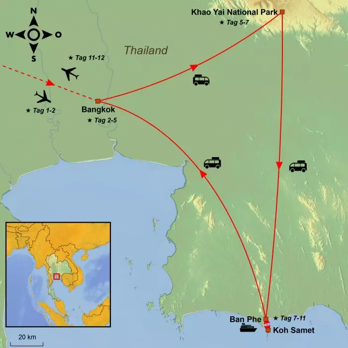 Erleben Sie das pulsierende Stadtleben Bangkoks bei einem aufregenden Street-Food-Ausflug mit dem Tuk-Tuk, entdecken Sie unberührte Natur und wilde Elefanten in Khao Yai und genießen Sie einen entspannten Badeurlaub an den weißen Stränden von Koh Samet.