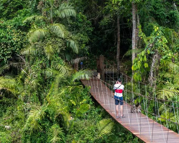Sie werden in den Nationalpark selbst gefahren, wo Sie und Ihr Guide einen erfahrenen Ranger treffen, der den Park wie seine Westentasche kennt. Es erwartet Sie eine Wanderung auf einem der schönsten Pfade des Parks. Die Wanderung ist zwischen 1,2 und 2 km lang und dauert zwischen 45 und 60 Minuten, je nach dem genauen Weg, den der Ranger wählt. Der Weg ist einer der kürzesten und einfachsten im Nationalpark und für Gäste jeden Alters geeignet. Der Weg schlängelt sich durch Regen- und Trockenwald bis zum kleinen Wasserfall Kong Kaew, der sich am Ende des Weges befindet. Unterwegs besteht eine gute Chance, von Baum zu Baum schwingende Gibbon-Affen zu sehen. Vogelliebhaber kommen auf ihre Kosten, denn der Park beherbergt 440 verschiedene Vogelarten, darunter die größte Population von Nashornvögeln in Thailand.