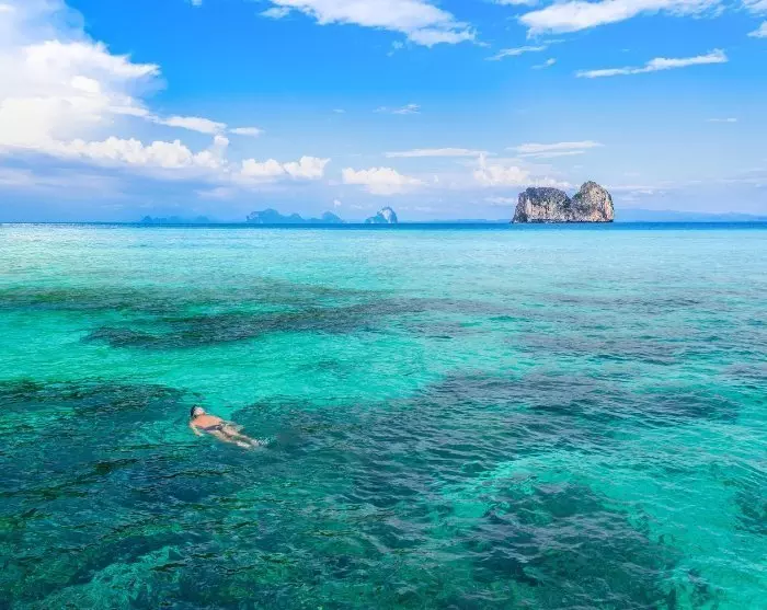 Sie steigen wieder in das Longtail-Boot, das Sie nach Koh Gai bringt – eine Insel, die wegen ihrer markanten Felsformation, die an einen Hühnerkopf erinnert, auch als Chicken Island bekannt ist. Die Insel bietet wunderschöne Strände und ist von kristallklarem Wasser umgeben, das von Korallenriffen und bunten Fischen wimmelt.