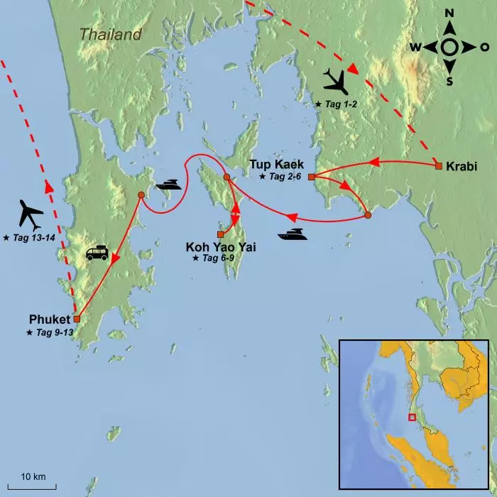 Erleben Sie Krabis dramatische Landschaft, die ruhigen Strände von Koh Yao Yai und das pulsierende Flair von Phuket – eine Reise voller Abenteuer, Entspannung und unvergesslicher Erlebnisse.