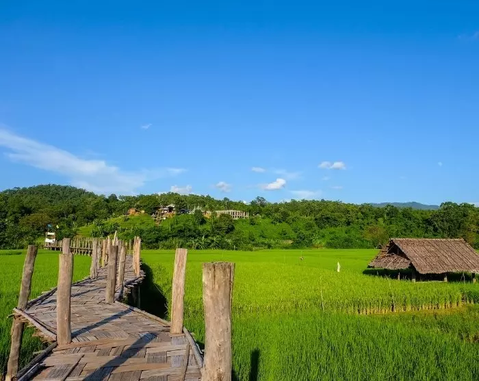 Der Ausflug führt Sie weiter zur legendären Sutongpe-Brücke. Die beeindruckende Bambusbrücke erstreckt sich durch üppige Reisfelder und verbindet ein Dorf mit dem buddhistischen Tempel Wat Phu Sama. Die Sutongpe Bridge ist eine der längsten Bambusbrücken Thailands und etwa 500 Meter lang. Sie wurde von Dorfbewohnern und Mönchen als Symbol für Zusammenarbeit und Glauben erbaut. Die Brücke spielt immer noch eine Rolle in ihrem Alltag, da Mönche sie täglich auf ihren Almosenrunden überqueren.