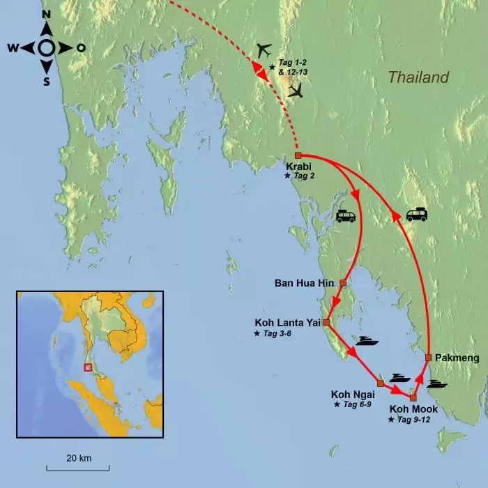 Im Laufe dieser Reise übernachten Sie auf drei sehr unterschiedlichen Inseln, alle mit einem ganz besonderen Charme: Koh Lanta, Koh Ngai und Koh Mook. Auf Sie warten feine weiße Sandstrände, wunderschöne Aussicht, hohe senkrecht aufragende Berge, kleine Dörfer sowie schnelle Speedboote und traditionelle Langboote, die Sie von einer Insel zur anderen bringen.
