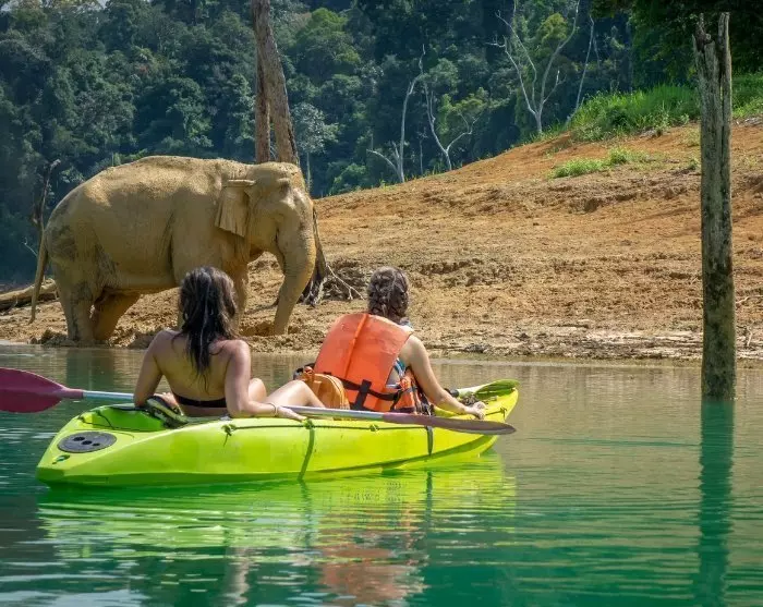 Die Fahrt vom Flughafen Surat Thani zu Ihrem Hotel dauert etwa 1 Stunde und 40 Minuten. Nach Ihrer Ankunft in Ihrer Unterkunft genießen Sie eine entspannte Kanufahrt auf dem Sok-Fluss. Es ist ein wirklich bezauberndes Erlebnis, lautlos auf dem Wasser zu treiben und die Geräusche und Eindrücke des umliegenden Regenwaldes aufzusaugen. Bewundern Sie die imposanten Kalksteinfelsen und die üppige, farbenprächtige Natur. Lauschen Sie dem Gesang der Vögel hoch in den Baumwipfeln und halten Sie am Flussufer Ausschau – mit etwas Glück entdecken Sie vielleicht einen Leguan . Das Beste daran ist: Sie können sich einfach zurücklehnen und entspannen, während Ihr lokaler Guide das Paddeln für Sie übernimmt.
