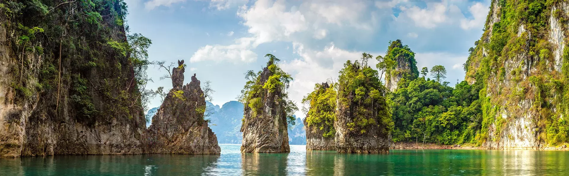 Danach geht es für Sie in den Süden von Thailand, zum wohl schönsten Nationalpark des Landes, zum Nationalpark Khao Sok. Dort wartet ein waschechtes Dschungelabenteuer auf Sie. Sie verbringen eine Nacht mitten im grünen Dschungel, lauschen dem Zwitschern der Vögel und dem Brüllen der Affen, und verbringen eine weitere Nacht auf dem malerischen Chiao-Lan-See, aus dem Kalksteinfelsen senkrecht aus dem smaragdgrünen Wasser des Sees aufragen.