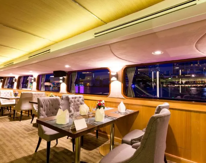 Kommen Sie mit auf einen der beliebten Abend-Cruises am Fluss Chao Phraya. Im Preis inbegriffen sind ein Willkommensgetränk, das Abendessen und Unterhaltung.