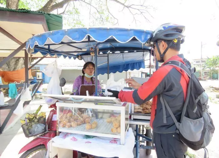 Wenn Sie Glück haben, fahren Sie unterwegs auch an einem Straßenverkäufer vorbei, bei dem Sie beliebte thailändische Desserts kaufen können: gebratene Bananen und „Kanom Kai Hong“, auch Schwaneneier genannt, die geschmacklich an Donuts erinnern.