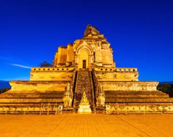 Weiter geht es durch die Altstadt von Chiang Mai. Sie besuchen das regionale Restaurant Heun Phen. Dort genießen Sie das berühmte, nordthailändische Gericht Khao Sai, ein Currygericht mit Nudeln, Gemüse und evtl. Fleisch. Nachdem der Hunger gestillt ist, geht es weiter zur wunderschön beleuchteten Tempelanlage Wat Chedi Luang, wo Sie den ikonischen Tempel von Chiang Mai bewundern und wieder Appetit aufbauen können.