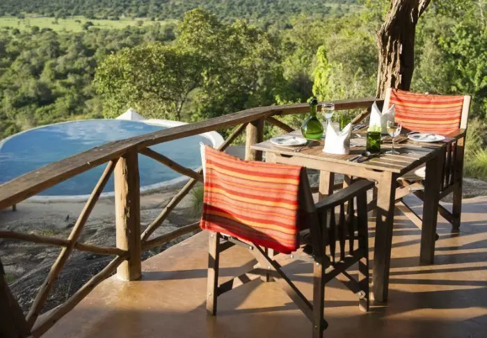 Die Aussicht vom Restaurant ist einfach atemberaubend. Ein Wasserloch in der Nähe zieht bei Sonnenuntergang häufig durstige Tiere an, sodass das Abendessen oft mit Aussicht auf Zebras und Impalas eingenommen werden kann.