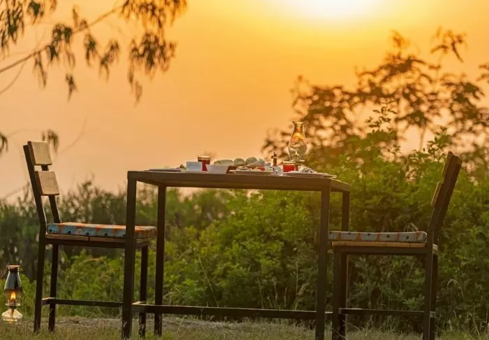 Auch im gemütlichen, mit Stroh gedeckten Restaurant oben am Berg können Sie die prächtigen Tiere am Wasserloch beobachten und die atemberaubenden Sonnenuntergänge über dem Park genießen, während Sie leckere Gerichte aus regionalen Zutaten sowie Zutaten aus dem eigenen Garten der Lodge einnehmen. Eine leichte Brise vom Kacherasee macht das Restaurant außerdem zum optimalen Ort für Abkühlung nach einem heißen Tag.
