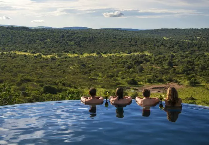 Vom Swimmingpool der Lodge aus können Sie die fantastische Aussicht auf das darunter liegende Tal genießen, in dem sich Büffel, Impalas, Warzenschweine, Zebras und weitere Savannentiere am Wasserloch versammeln. Auf den Felsen können Sie mit etwas Glück auch den seltenen hier heimischen Klippspringer beobachten.