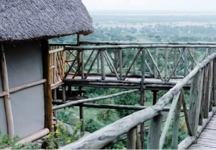 Die Lodge besteht aus „Bandas“-Hütten, die charakteristischen Hütten aus einem kleinen afrikanischen Dorf ähneln. Die Hütten sind auf den Hang verteilt. Einige davon besitzen zwei Etagen, von allen aber hat man eine herrliche Aussicht auf die Ebene und die traditionelle afrikanische Landschaft. Die Hütten sind mit 18 modernen Zimmern mit gemütlichen Betten und einem eigenen Badezimmer ausgestattet.