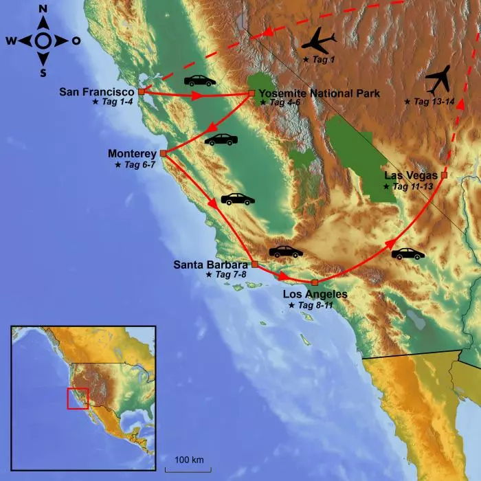 Träumen Sie von einem ziemlich kurzen Selbstfahrer-Abenteuer im Westen der Vereinigten Staaten, wo Sie unterwegs viele berühmte Sehenswürdigkeiten erleben werden? Und möchten Sie den Kontrast zwischen den Küstenstädten der USA und der Wüste spüren? Wenn ja, ist diese Reise voller Highlights von San Francisco in Kalifornien bis Las Vegas in Nevada die richtige Wahl für Sie.
