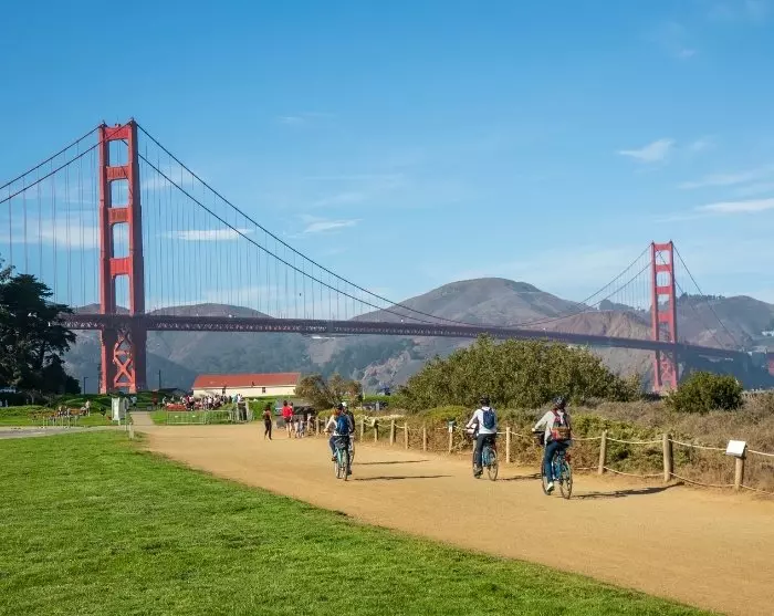 Verpassen Sie nicht die Fahrt über die legendäre rote Hängebrücke, die 1937 eröffnet wurde. Von der anderen Seite der Brücke aus haben Sie einen atemberaubenden Blick über die Dächer der Stadt und nicht zuletzt auf die Gefängnisinsel Alcatraz. Hier waren von 1934–1963 die gefährlichsten Kriminellen Amerikas untergebracht, darunter der Gangster Al Capone. Sie können die Brücke auch mit dem Fahrrad überqueren – an vielen Orten in der Gegend um Fisherman’s Wharf kann man nämlich Fahrräder mieten.