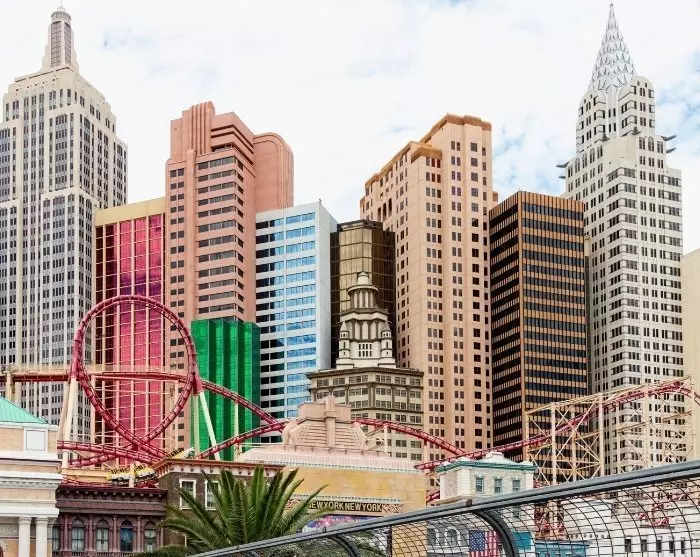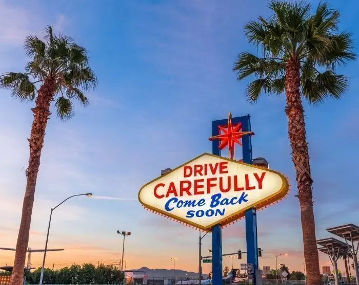 Nach ein paar weiteren Stunden Fahrt von Barstow aus können Sie plötzlich Las Vegas in der Ferne erahnen. Wenn Sie sich der Stadt nähern, können Sie skurrile Gebäude am Horizont aufragen sehen. Dies sind die berühmten Themenhotels, die nebeneinander am fast 7 km langen Las Vegas Blvd. – auch „The Strip“ genannt – liegen.