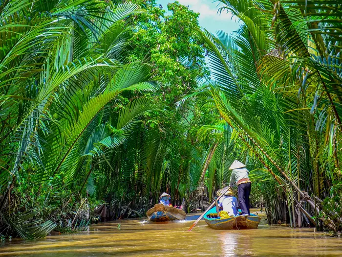 Nach einer etwa 2 1/2-stündigen Fahrt erreichen Sie die Stadt Cai Be. Dort gehen Sie an Bord eines Bootes und legen ab zu einer Fahrt durch das üppige Mekongdelta. Sie besuchen lokale Werkstätten, in denen talentierte Kunsthandwerker Produkte aus Kokos herstellen. Anschließend fahren Sie in einem kleinen Sampan – einem traditionellen, geruderten Holzboot – durch die schmalen, mäandernden Kanäle des Mekong-Deltas.