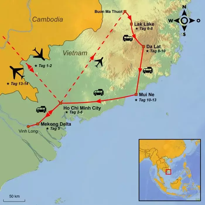 Erleben Sie den Charme des Mekong-Deltas, die friedliche Natur von Lak Lake und die kühle Magie des Hochlands von Da Lat – nach dem Großstadtleben in Ho-Chi-Minh-Stadt und vor den Palmenstränden in Mui Ne.