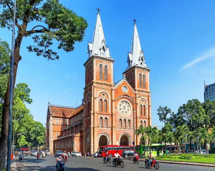 Direkt gegenüber dem Alten Postamt steht die ikonische Kathedrale Notre Dame, die zwischen 1863 und 1880 errichtet wurde. Dieses beeindruckende Relikt der französischen Kolonialzeit mit seinen markanten roten Ziegeln und den hohen Türmen zählt bis heute zu den meistgeschätzten Wahrzeichen der Stadt.