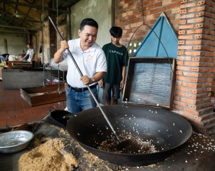 Dann bringt Sie Ihr Tuk-Tuk entlang der ruhigen Dorfstraßen. Der erste Halt ist das Haus einer einheimischen Familie, wo Sie com dep (grüne Reisflocken) probieren und sehen können, wie Puffreis traditionell hergestellt wird.