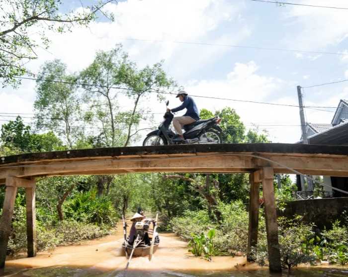 Der Thu-Bon-Fluss fließt durch das Herz der Stadt, die im 17. und 18. Jahrhundert ein wichtiger Handelshafen war. Heute bildet das Ufer eine friedliche, malerische Kulisse des Alltags, und kleine Boote gleiten noch immer sanft über das Wasser.