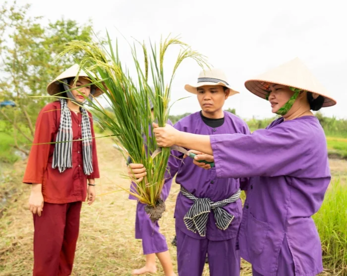 Die Reise geht weiter zu unserem sozialen Nachhaltigkeitsprojekt in Vinh Long, das von unserem lokalen Partner ins Leben gerufen wurde. Bei einem gemütlichen Spaziergang durch das Dorf erklärt Ihnen Ihr Guide mehr über das Projekt. Sie haben außerdem die Gelegenheit, das traditionelle Landleben hautnah zu erleben. Gemeinsam mit den lokalen Bauern probieren Sie sich im Reisanbau – je nach Saison beim Einpflanzen junger Reissetzlinge oder bei der Ernte. Es ist eine lehrreiche und bodenständige Erfahrung, die Ihnen einen authentischen Einblick in das tägliche Leben in Vietnams ländlichen Regionen und in das Engagement für nachhaltige Landwirtschaft vermittelt. Durch Ihre Teilnahme an diesem Ausflug leisten Sie zudem einen positiven Beitrag für die Familien in Vinh Long, da ein Teil des Reisepreises direkt in das Projekt fließt. Mehr Informationen dazu finden Sie hier.