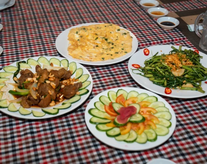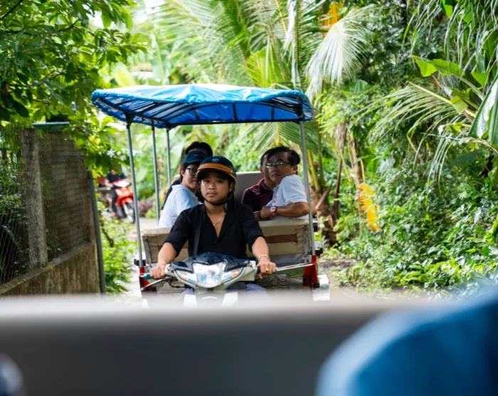 Die Bootsfahrt führt Sie zu einer friedlichen Insel inmitten des Mekong, wo Sie ein vietnamesisches Mittagessen aus frischen, regionalen Zutaten genießen – umgeben von Grün und dem ruhigen Rhythmus des Lebens am Fluss.