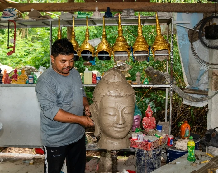 Die Tour führt Sie weiter zu einem talentierten Khmer-Handwerker, der Statuen und Masken für die Pagoden der Region fertigt.