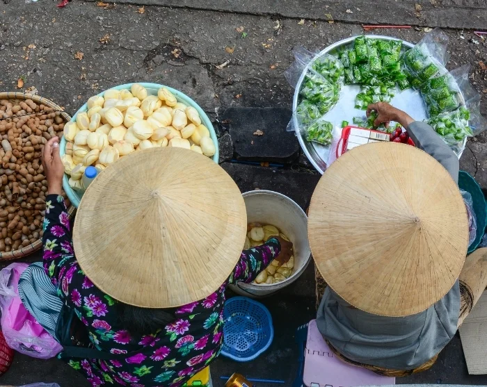 Begeben Sie sich danach in die Gegend um die Long-Biên-Brücke und den nahegelegenen Long-Biên-Markt, wo Stände, hoch beladen mit Obst, Gemüse und Blumen, bis auf die Straßen hinausreichen und ein lebendiges Bild des städtischen Alltags zeichnen. Das Tempo ist zu jeder Tageszeit hoch, die Atmosphäre unverfälscht.