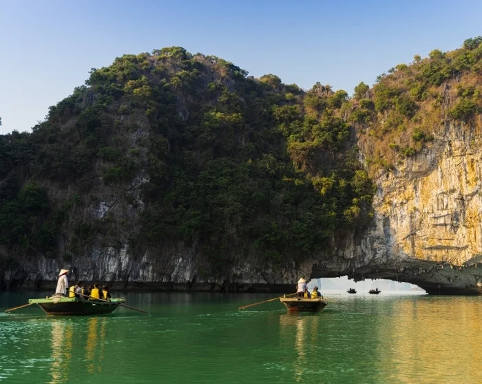 Von hier geht es an die Küste zur stillen Lan-Ha-Bucht. Auf einer Minikreuzfahrt gleiten Sie zwischen von üppiger Vegetation überwachsenen Kalksteinfelsen hindurch, erkunden Höhlen und haben die Möglichkeit, in ruhigen Gewässern Kajak zu fahren – ein Naturerlebnis fernab der meistbefahrenen Routen.