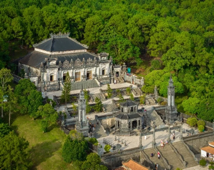 Danach fahren Sie weiter zum Mausoleum von Kaiser Khai Dinh, das sich deutlich von den anderen Kaisergräbern der Umgebung unterscheidet. Anfang des 20. Jahrhunderts erbaut, vereint der Komplex traditionelle vietnamesische Elemente mit europäischen barocken und gotischen Einflüssen. Das Ergebnis ist ein prachtvolles, detailreiches Architekturensemble, das die Faszination des Kaisers für westliche Kunst und Kultur widerspiegelt. Das Grab liegt am Fuß des Chau-Chu-Berges, etwa 9 km südlich von Hué.