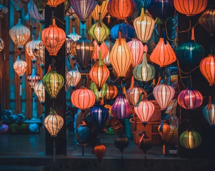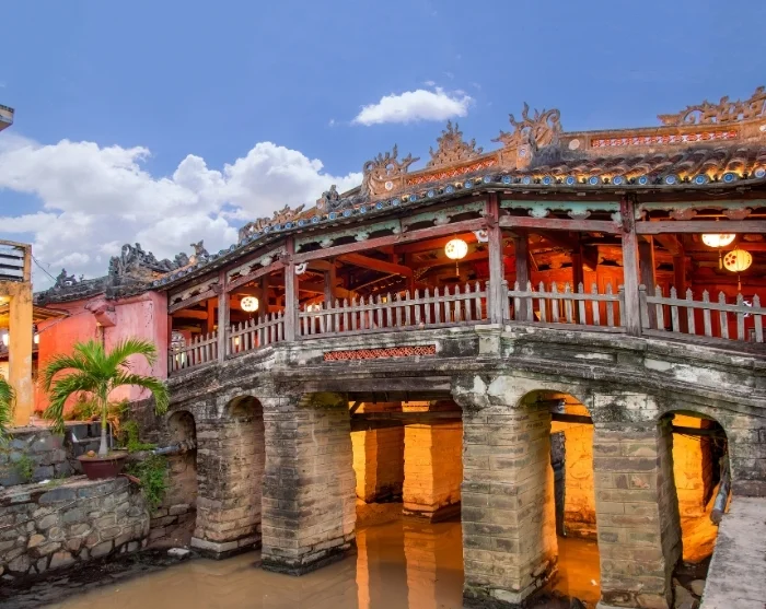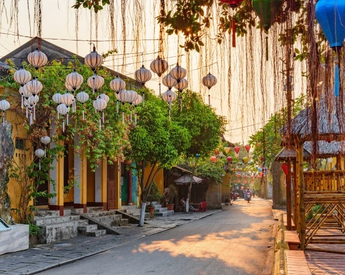 Jenseits des Flusses breitet sich ein Labyrinth kleiner, stimmungsvoller Gassen aus. Hier finden Sie eine farbenfrohe Mischung aus japanischen Holzhäusern, chinesischen Versammlungshallen, französischen Kolonialbauten und charakteristischen Kaufmannshäusern. Bunte Laternen hängen wie Girlanden über den Straßen und schaffen eine besondere Atmosphäre – besonders nach Einbruch der Dunkelheit. Geschäfte, Street-Food-Stände, Cafés und kleine Restaurants säumen die Gassen und laden zu entspannten Momenten und neugierigen Entdeckungen ein.