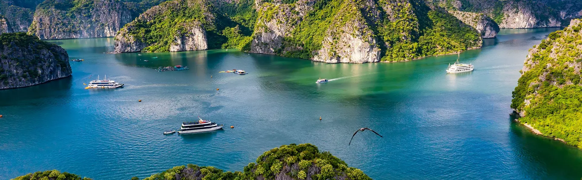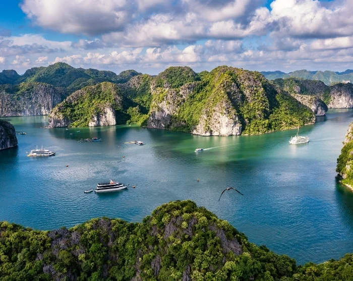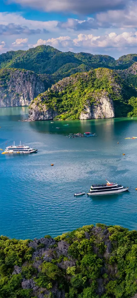 Die Lan-Ha-Bucht grenzt im Süden an die Halong-Bucht und umschließt die Insel Cat Ba. Sie gehört zum gleichen geologischen Gebiet und besticht durch markante Kalksteinformationen, üppig bewachsene Inseln und klares, grünlich schimmerndes Wasser. Gleichzeitig ist die Lan-Ha-Bucht ruhiger und weniger besucht – mit weniger Booten, kleinen schwimmenden Fischerdörfern und mehr unberührter Natur.