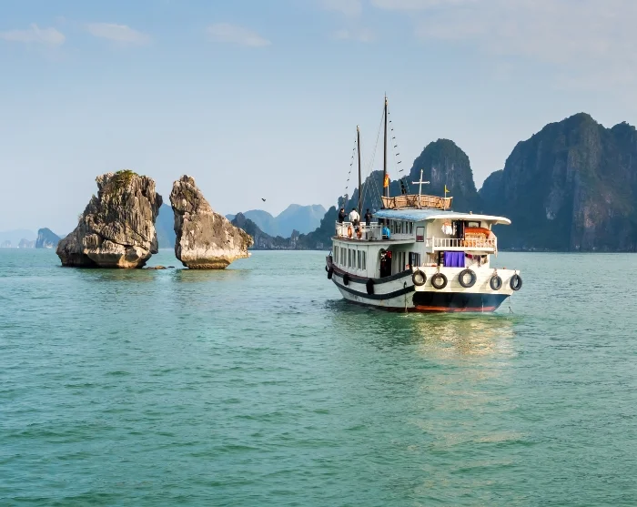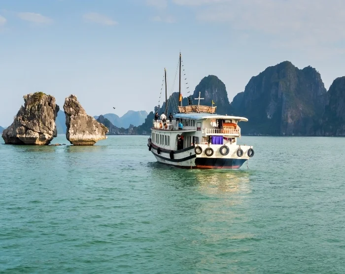 An Bord werden Sie bei einem erfrischenden Drink begrüßt und die Besatzung erläutert kurz das bevorstehende Abenteuer. Anschließend können Sie sich in Ihrer Kajüte einrichten und auf ein schmackhaftes Mittagessen mit vietnamesischen Spezialitäten und internationalen Speisen vorbereiten. Zwischenzeitlich fährt das Schiff ganz still hinaus in das smaragdgrüne Wasser. Unterwegs genießen Sie die Aussicht auf einige der legendärsten Felsformationen der Halong-Bucht, beispielsweise Incense Burner, Dog Stone Islet, Fighting Cock Islet und Three Coconuts Island.