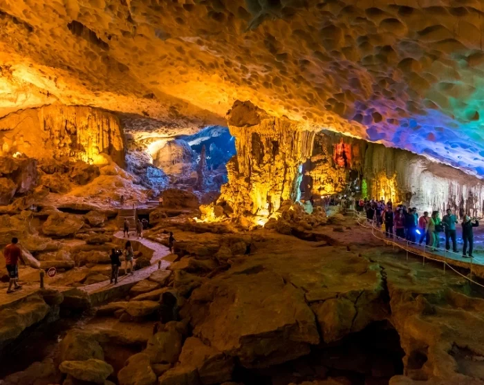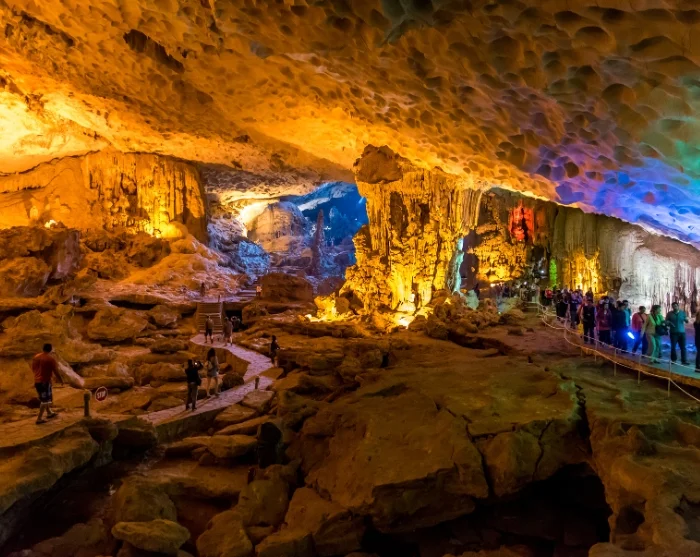 Die Fahrt geht dann weiter zur Sung Sot-Grotte, der größten Grotte der Halong-Bucht und gleichzeitig die beeindruckendste Tropfsteinhöhle. In der Grotte werden Sie mit einer magischen Landschaft von Stalaktiten und Stalagmiten belohnt, die sich in Millionen Jahren gebildet haben. Insbesondere bei Regen empfehlen wir gutes, geschlossenes Schuhwerk.