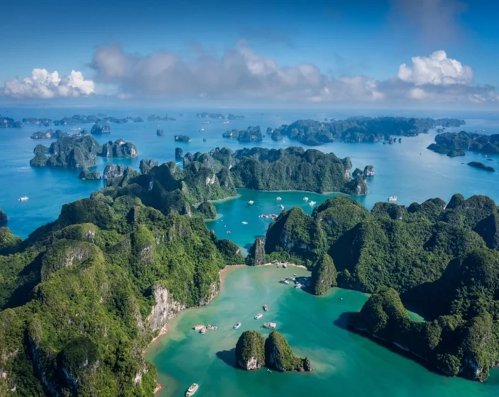 Die Halong-Bucht ist eines der charakteristischsten Naturgebiete Vietnams. Hier ragen hunderte grün bewachsene Kalksteinfelsen senkrecht aus dem Meer, das im Laufe des Jahres die Farbe von tiefblau zu jadegrün wechselt. Auf der größten Insel, Cat Ba, gibt es einige Dörfer, auf manchen der kleineren Inseln kleinere Fischerdörfer. Für Touristen ist die Halong-Bucht vorwiegend ein wundervolles erstklassiges Naturgebiet, während sie für Vietnamesen mit Legenden um Drachen und Drama verbunden ist. Die Bucht erstreckt sich über ca. 1.500 km² und wurde 1994 in das UNESCO Welterbe aufgenommen.