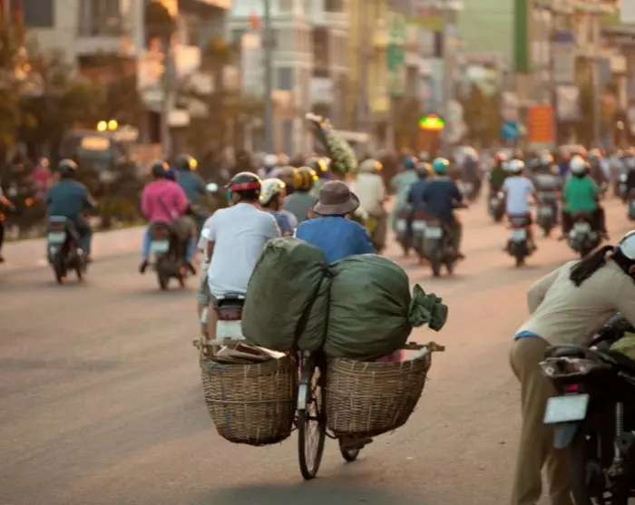 Abends, nach Sonnenuntergang, erwacht Ho-Chi-Minh-Stadt so richtig, und Millionen von Menschen steigen auf ihre Motorroller und fahren in die beleuchtete Metropole, um zu Abend zu essen und sich mit Freunden zu treffen.