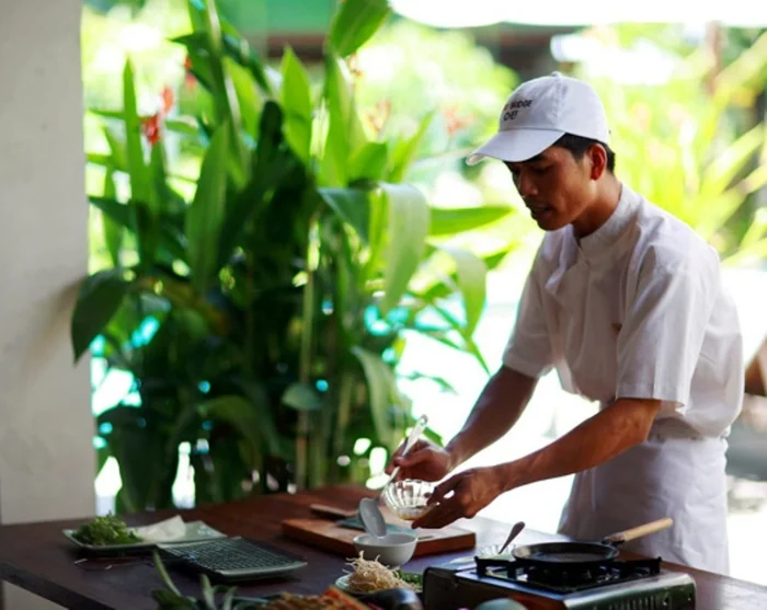 Nach etwa 25 Minuten erreichen Sie die Red Bridge Cooking School, machen eine Führung durch den grünen Kräutergarten, bevor Sie sich die Schürze umbinden und anfangen, zu kochen. Der lehrreiche und entspannte Kochkurs an sich dauert etwa zwei Stunden. Zunächst zeigen die Köche, wie die Speisen zubereitet werden, anschließend sind Sie an der Reihe.