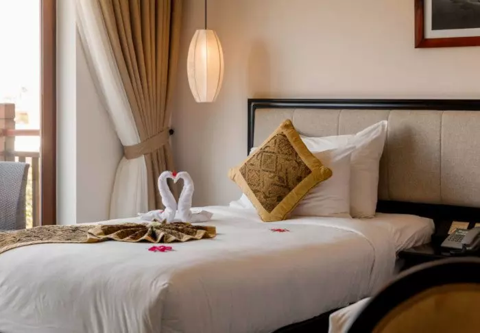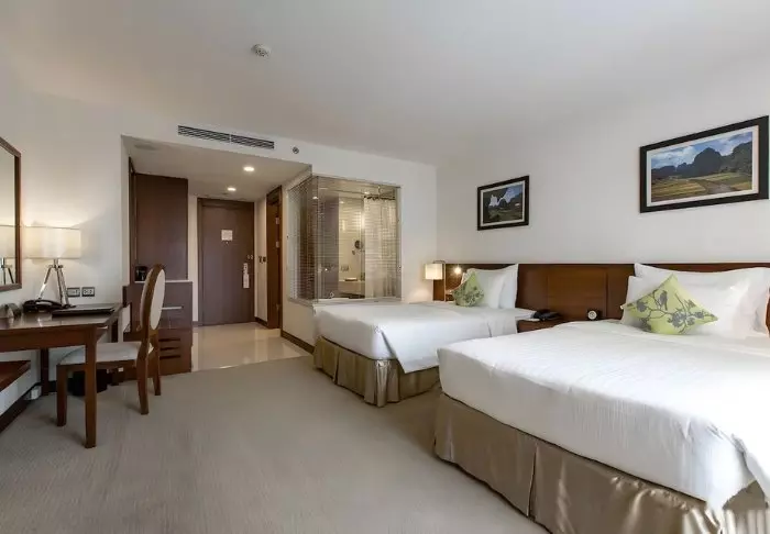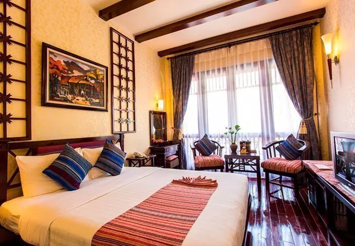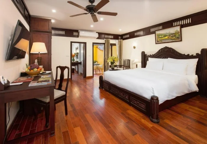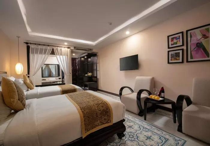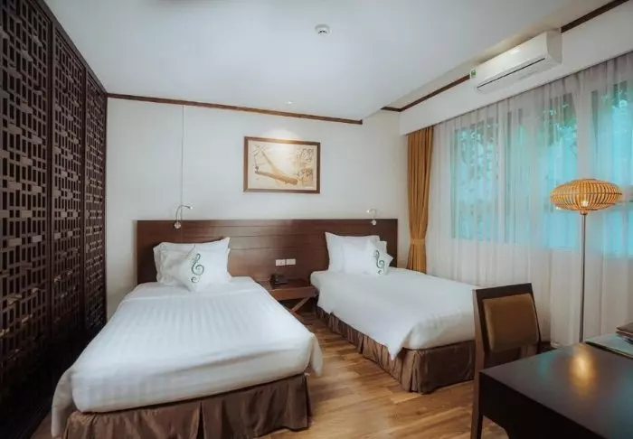 Prinzipiell wohnen Sie in einem Superior-Zimmer mit modernem Komfort und einem Hauch vietnamesischer Eleganz. Durch die großen Fenster der Zimmer fällt viel Tageslicht ein, Holzelemente und klassische Möbel sorgen für eine warme und einladende Atmosphäre. Bemerkenswert sind die Wandpaneele mit blühenden Kirschzweigen, die für einen regionalen und künstlerischen Touch sorgen. Alle Zimmer sind mit einem Doppelbett oder zwei Einzelbetten, Kühlschrank, TV, Safe, Wasserkocher, Klimatisierung und eigenem Bad mit Toilettenartikeln und Föhn ausgestattet. Die durchdachten Einzelheiten sorgen für einen ruhigen Ausgangspunkt, an dem Sie sich nach den Erlebnissen des Tages gut erholen können.