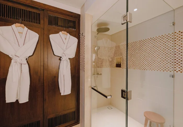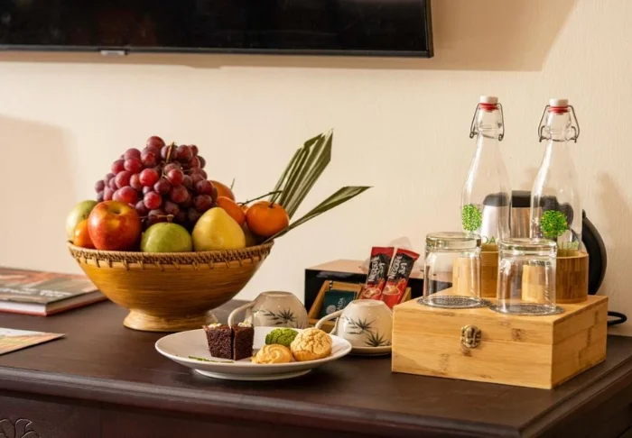 Das Resort verfügt über wunderschöne, geräumige Zimmer und Bungalows inmitten der üppigen, gepflegten Gärten mit leichtem Zugang zu den Pfaden, die zum Swimmingpool und zum Strand führen. Alle Zimmer und Bungalows sind in hellen Farben gehalten und mit wunderschönen Holzmöbeln ausgestattet. Jeden Wohneinheit verfügt über eine Klimaanlage, WLAN, eine Minibar, eine Sicherheitsbox, einen Fernseher und einen elektrischen Wasserkocher, damit Sie sich eine Tasse Kaffee oder Tee auf Ihrer privaten Terrasse zubereiten können. Das Badezimmer ist mit einer Dusche ausgestattet. Außerdem finden Gäste Pflegeprodukte, einen Haartrockner, einen Bademantel und Hausschuhe.