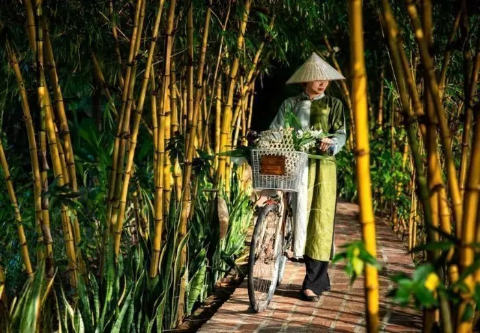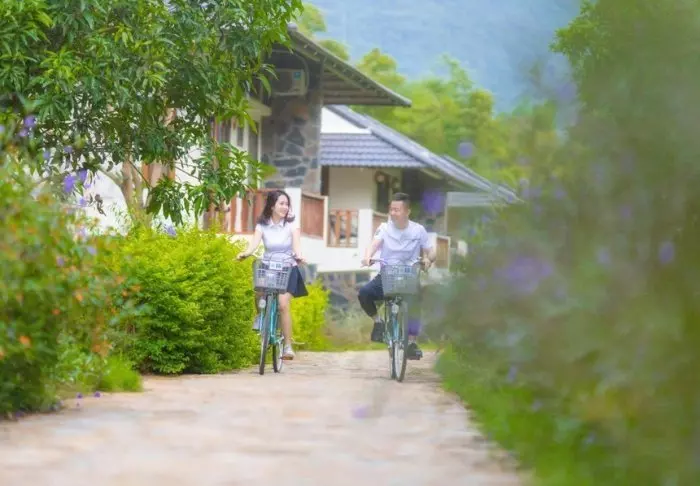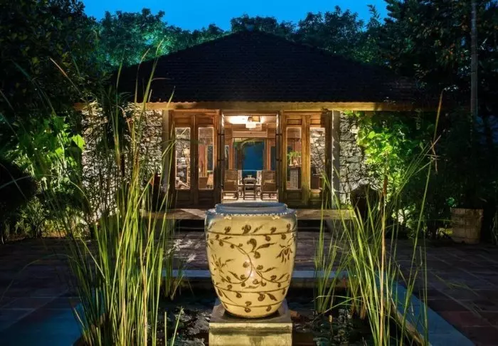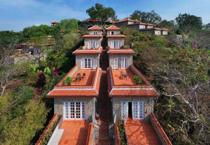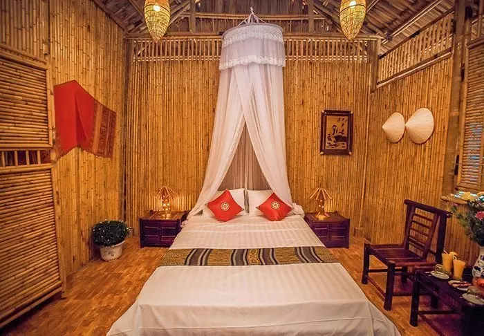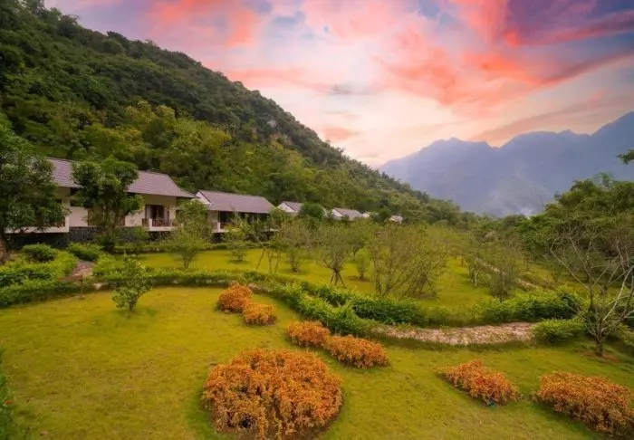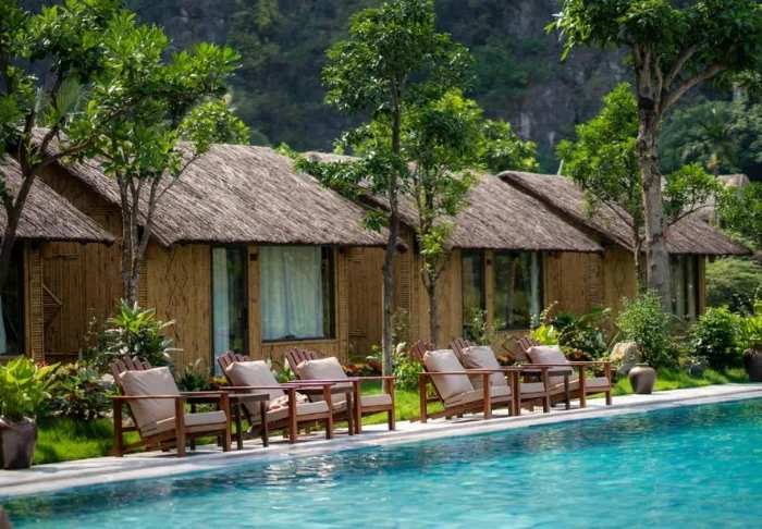Die Gebäude des Resorts sind zweigeschossig; gelbe Fassaden, rote Ziegeldächer und Details aus dunklem Holz prägen das Bild – inspiriert von der traditionellen Architektur Nordvietnams. Zudem gibt es im Emeralda eine kleine Ausstellung, die Einblicke in Kultur und Geschichte Vietnams bietet und die besondere Atmosphäre des Resorts unterstreicht.