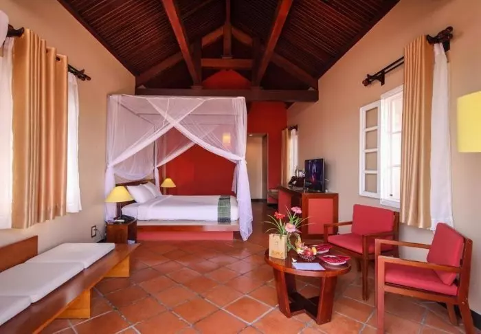 Sie übernachten in der Regel in einem 36 m² großen Superior-Zimmer – ideal für zwei Personen. Holzböden, Möbel aus dunklem Holz und helle Wände sorgen für eine ruhige, zurückhaltende Anmutung. Von hier genießen Sie Ausblicke auf den Ngo-Dong-Fluss und die Umgebung des Resorts; außerdem verfügt jedes Zimmer über einen eigenen Balkon oder eine Terrasse. Zur Ausstattung gehören eine Klimaanlage und Verdunkelungsvorhänge sowie TV, WLAN, Telefon, Safe, Kühlschrank und ein Wasserkocher für Tee und Kaffee. Kostenfreies Mineralwasser in Flaschen steht bereit. Das Bad ist mit Dusche und Badewanne ausgestattet; Pflegeprodukte, Bademantel, Hausschuhe und ein Haartrockner sind ebenfalls vorhanden.