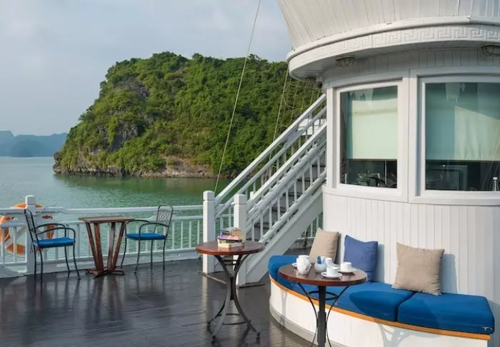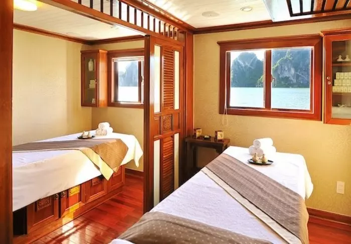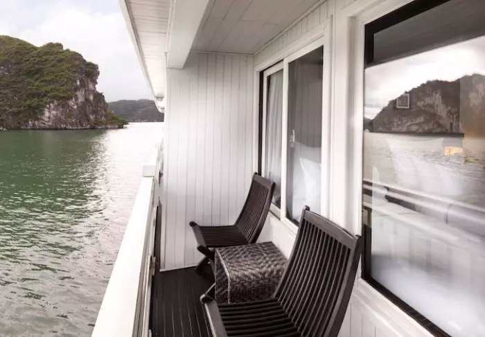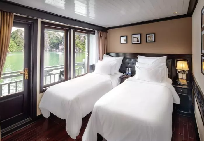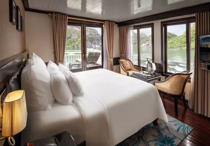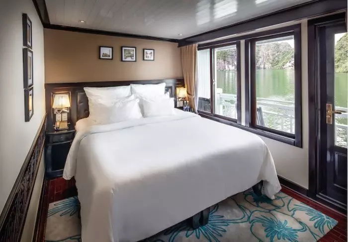 Das Schiff bietet 24 Kabinen auf zwei Decks, die vom traditionellen vietnamesischen Kunsthandwerk und der regionalen Kultur inspiriert sind. Die Kabinen sind mit edlem dunklen Holz, kunstvollen Details und großen Panoramafenstern mit Blick auf die Bucht gestaltet. Sie verfügen über Klimaanlage, Minibar, Safe, Tee- und Kaffeezubereitungsmöglichkeiten sowie ein Badezimmer mit Badewanne und separater Dusche. Die großzügigen Kabinen verbinden warme Materialien mit modernem Komfort und bieten Ihnen den idealen Rückzugsort zwischen den täglichen Erlebnissen.